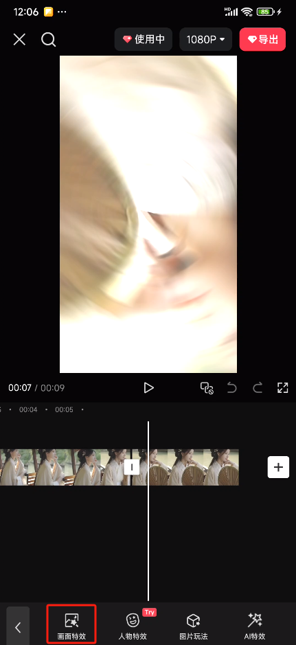 步骤 04 选中定格画面素材,点击“剪辑”按钮 ,滑动一级工具栏找到“特效”,进入后点击“画面特效”按钮 。