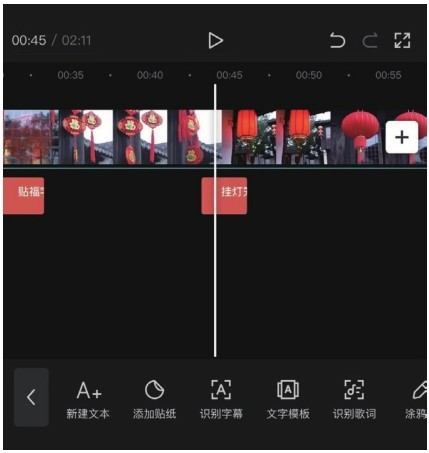 步骤 02 点击底部工具栏中的“文本”按钮 ,再点击二级工具栏中的“新建文本”按钮 ,在视频素材开头处添加内容为“新春快乐”的文字,如图4-38所示。