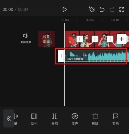 步骤 03 选中添加好的音乐素材,点击“节拍”按钮 ,开启“自动踩点”功