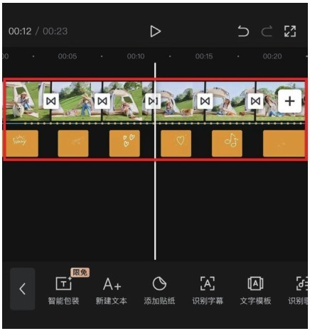 步骤 08 保存后将时间线拖至素材开始处,点击底部工具栏中的“贴纸”按钮,在“线条风”分类下为每一段素材添加合适的贴纸,并调整其位置与大小,效果如图6-70所示。同时调整每一段贴纸素材的时长,使贴纸素材与转场效果错开,如图6-71所示。