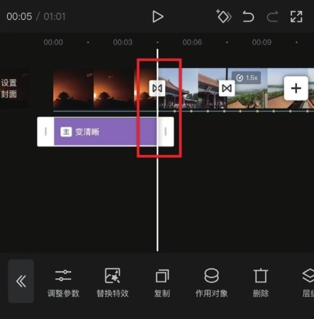 步骤 01 将时间线拖至视频开始处,点击底部工具栏中的“特效”按钮 ,再点击二级工具栏中的“画面特效”按钮 ,在“基础”分类下选择“变清晰”特效,点击“调整参数”按钮,适当调整对焦速度和模糊强度,如图7-22所示。
