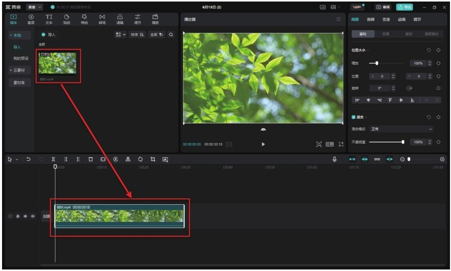 步骤 01 在剪映中导入名为“树叶”的视频素材,将其添加至时间轴,如图8-28所示。图8-28