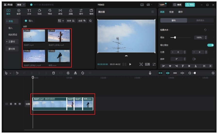 步骤 01 在剪映中分别导入名为“电线杆”“电线杆上的鸟”“电线杠上的鸟儿”“特写”的视频素材,将其添加至时间轴,如图12-8所示。图12-8