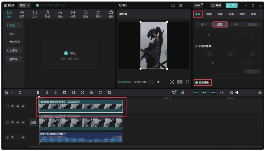 步骤 04 复制本段视频素材至画中画轨道,选中画中画轨道上的视频素材,单击“抠像”选项,切换至“抠像”功能区,开启“智能抠像”功能,如图13-4所示。