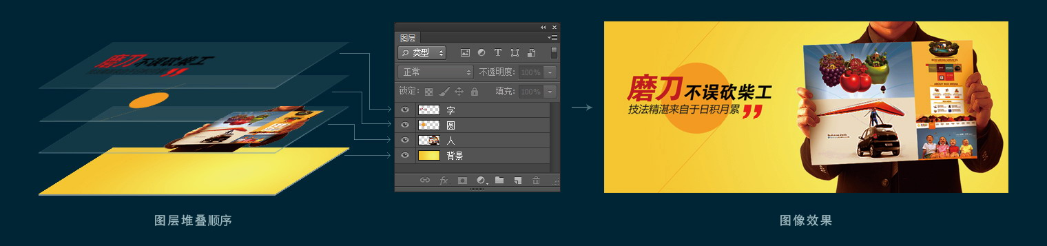 通俗地讲,图层就像包含文字或图形等元素的胶片,它们按顺序叠放在一起,组合起来呈现图像的最终效果,如图3-2所示。