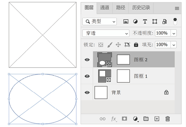 在工具箱中选择图框工具,在属性栏中,可以选择图框的形状(方形或圆形),在画布中拖曳即可绘制图框。绘制时按住Shift键可以绘制正方形或圆形图框,此处绘制一个正方形和一个椭圆形,如图8-17所示。绘制好图框后,“图层”面板中会生成图框图层。若将图像直接拖到图框上,则图像只在图框内显示,如图8-18所示。