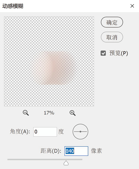 接下来以图13-13为例,制作鸡蛋晃动效果。在Photoshop中,打开鸡蛋文件并复制鸡蛋图层,对下层鸡蛋选择“滤镜”→“模糊”→“动感模糊”命令,弹出“动感模糊”对话框,如图13-14所示。设置“角度”可调节模糊的方向,这里设置“角度”为0度,使鸡蛋模糊方向为水平方向。“距离”用于设置模糊的范围,这里设置“距离”为840像素,使鸡蛋的晃动效果明显,效果如图13-15所示。