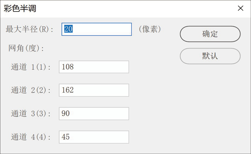 以图13-19为例,在Photoshop中,打开图像并复制一层,将复制出的图层转换为智能对象图层,选择“滤镜”→“像素化”→“彩色半调”命令,弹出“彩色半调”对话框,如图13-20所示。“最大半径”用于设置网点的大小,取值范围为4~127像素,这里设置为20像素。“网角(度)”选项组用于设置每个颜色通道的网格角度,其下共有4个通道,分别代表填入颜色的网角。需要注意的是,对于不同颜色