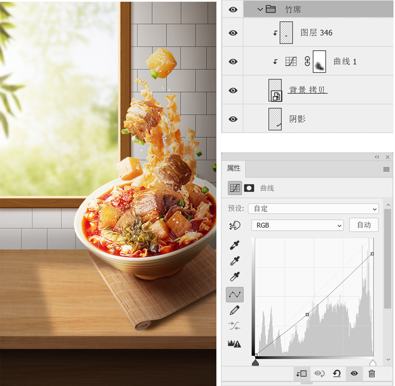 在竹席上方,添加曲线调整图层,使竹席的暗度673与碗面的暗度相当。同时,根据光影关系,使用黑色画笔工具编辑图层蒙版,将受光部分提亮,同时为竹席添加阴影,使竹席更好地融入画面,如图16-15所示。