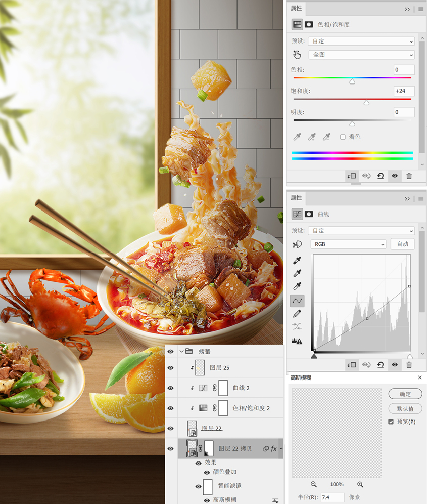 置入筷子素材,通过自由变换将筷子进行翻转,并将筷子旋转到合适的角度,放置在碗面的上方。在筷子图层上方,添加色相/饱和度调整图层,将筷子调整为与画面色调接近的色调;并添加内阴影样式,为筷子添加逆光效果。复制筷子图层,添加颜色叠加样式,为筷子制作投影,并添加智能滤镜和高斯模糊滤镜,使投影边缘更加柔和。为阴影添加图层蒙版,用选区工具填充黑色,将阴影超出窗口的部分隐藏,如图16-16所示。