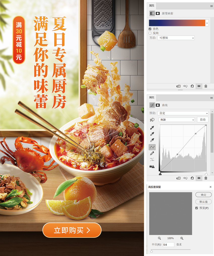 对于本案例,客户主营项目为美食订购,属于餐饮行业,由此信息可确定海报的主色调。在设计中餐饮行业的海报多以暖色调为主,容易让用户产生食欲和感觉到温馨。结合客户提供的文案“夏日专属厨房,满足你的味蕾”“满30元减10元”,可知客户的主要需求是体现促销活动的内容和优惠力度,因此在设计中就要通过合理的视觉元素增强用户的代入感,从而引入优惠活动。