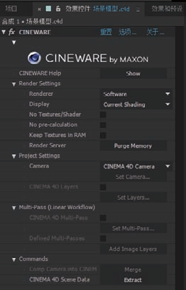 加了外部合成标签的对象即可在After Effects中进行编辑。还是回到After Effects,加入到合成中的场景模型看来没有什么特别。打开模型层的【效果控件】对话框看看。(注:学习使用的模型位于配套素材>LESSON 10>C4D。)