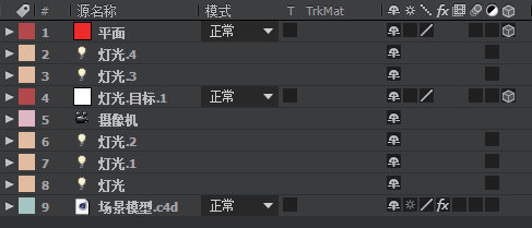 首先来看看最下方【CINEMA 4D Scence Data】参数,单击【提取】,可以提取模型的场景信息。可以看到,场景中设置了外部标签的对象全部成为合成中的层。如图10-6-5所示。
