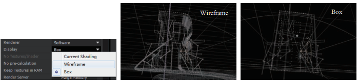 在场景调整过程中,如果场景比较复杂或者机器不给力,还可以在【Software】模式下的【Display】下拉列表中选择【Wireframe】或者【Box】,以线框或盒子形状显示场景模型,以加快刷新速度。如图10-6-8所示。