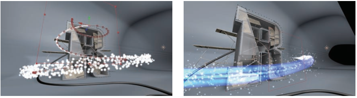 链接完成,播放影片,可以看到粒子跟随场景中的路径行进。如图10-6-17所示。接下来,我们进一步调整粒子参数,利用之前学到的知识,制作一个炫酷的光效。注意场景中的遮挡通过设置【Visibility】参数来实现即可。