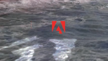 STEP 38 在 【 时间轴 】 窗口中,单击层“ADOBE LOGO.ai”的【模式】面板下方的参数,弹出列表参数栏。选择【叠加】混合模式。可以看到,【合成】窗口中的LOGO与海水融合在一起。如图1-3-59所示。注意如果在【时间轴】窗口中找不到【模式】面板,单击窗口下方的按钮,或者按“F4”键切换到【模式】面板即可。