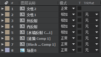 STEP 32 接下来我们制作反射倒影。选择合成中的“女性1”“女性2”“涟漪Comp1”三个层,为其建立副本,分别该名为“内反射”(人物在水墙内)、“外反射”(人物在水墙外)和“水墙反射”,并拖动改变层的排列顺序。如图6-3-17所示。