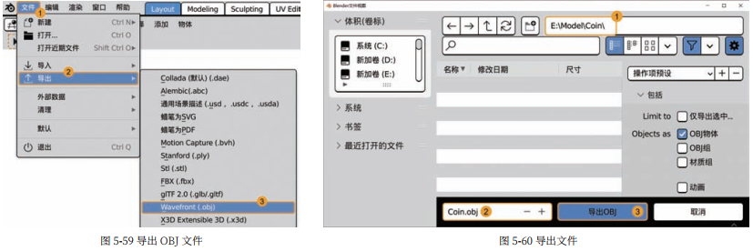 模型制作完成后可以导出为一个文件,以便导入其他的三维软件中使用或者修改,也可以用作 3D 打印。当前的文件中只有一个模型,所以无须选中模型,直接执行文件 > 导出命令即可导出模型。导出设置中还有很多文件格式可供选择,Blender比较特别的就是需要指定要导入和导出的文件格式。常用的 3D 文件格式有 FBX(可以保存动画)、OBJ(最常见的三维模型文件格式,可用于 3D 打印)、STL(3D 打印使用)等,绝大部分文件格式都是通用的,普通的三维软件都可以打开。这里的金币模型只有模型,没有材质也没有动画,使用 OBJ 格式即可。执行文件 > 导出 >Wavefront(.obj) 命令,如图 5-59 所示,然后在文件视图中找到要用来保存模型文件的文件夹(推荐新建一个专门的文件夹来保存模型文件),单击“导出 OBJ”按钮即可,如图 5-60 所示。导出不同格式的文件的方法都一样,但是文件视图右侧的选项会根据格式显示不同的选项。当前的金币模型完全符合 3D 打印的要求,可以发送给 3D 打印的厂家打印或者自己打印,也可以导入其他的三维软件中进一步制作贴图。