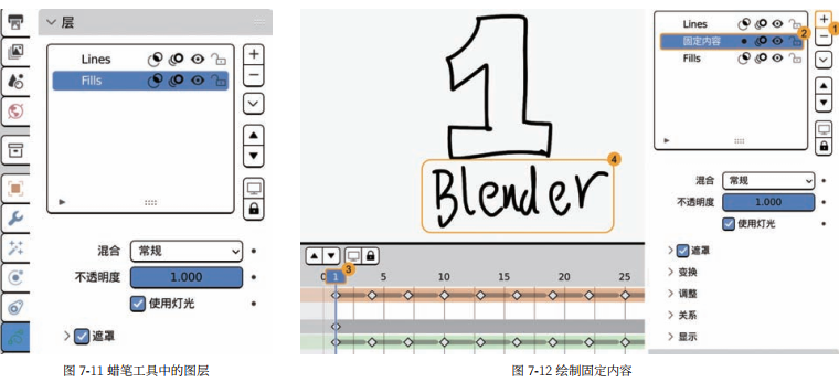 4. 图层:蜡笔工具中是有图层的,如图 7-11 所示。在物体数据属性中,哪个图层被选中了,处于激活状态,就会画在哪个图层中,刚才就是画在了 Fills 图层中,单击图层右侧的眼睛图标即可隐藏图层,加减号按钮可以用来添加和删除图层,这都是基本操作。刚才绘制的内容都是到下一个关键帧就消失了,如果想要绘制的内容贯穿整个动画,就可以新建一个图层命名为“固定内容”, 然后在第一帧绘制,如图 7-12 所示。拖动时间轴可以看到绘制的内容一直都存在,但在绘制其他内容时一定要切换回原本的图层!之所以能做到固定内容,是因为之后没有新的关键帧,所以第一个关键帧会一直存在。