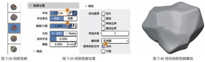 4. 基本形雕刻:雕刻之前先保存一次文件,第一次雕刻需要反复练习,如果雕刻的效果不好,直接重载文件重新雕刻即可。首先要制作出大块的切面,需要使用到刮削笔刷,如图 7-38 所示。刮削笔刷可以起到刮平的作用,先设置好刮削笔刷,把“半径”改为较大的数值,将“强度 / 力度”改为 1,在“高级 > 使用初始文件”中勾选“法向”,如图 7-39 所示。笔刷设置好后即可在模型上涂抹,按住鼠标左键不放可以反复涂抹,边旋转视图边刮削,直到把模型雕刻得棱角分明,如图 7-40 所示。笔刷的设置尤其是半径要根据情况实时调整, 按一下 F 键,左右拖动鼠标即可快速调整笔刷半径;按快捷键 Shift+F 可以调整笔刷强度。