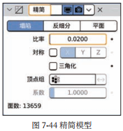 7. 后期处理:模型经过重构后面数非常多,如果直接使用在场景中会非常消耗计算机的内存,所以需要减少面数。 第一种方法是重构拓扑,就是在高面数的模型上重新建模,建立一个低面数的模型,再细分,然后把高面数模型的细节传递到低面数模型上,这属于比较专业的高级操作; 第二种方法就简单多了,直接使用“精简”修改器,首先切换到 Layout 或者 Modeling 布局,给石头添加一个精简修改器 ,然后将“比率”改为 0.02,也就是保留 2% 的面,如图 7-44 所示,这样会损失一些细节。至此石头就雕刻完成了。