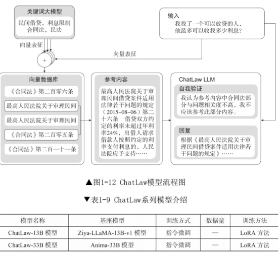 ChatLaw模型 是由北京大学提出的,主要由大型语言模型、关键词生成模型和向量匹配模型三个部分组成,如图1-12所示。而大型语言模型的基座采用LLaMA模型架构,并采用大量法律新闻、法律论坛、法条、司法解释、法律咨询、法考题、判决文书等原始文本构造对话数据集进行模型的指令微调。ChatLaw系统模型共涉及2 个模型,详细如表1-9所示。