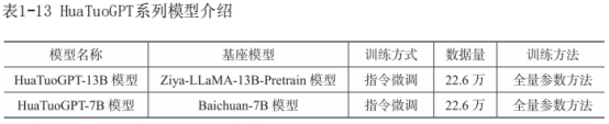 HuaTuoGPT模型 是由香港中文大学深圳数据科学学院和深圳大数据研究院提出的,模型底座采用Baichuan和LLaMA等多个底座模型,通过Self-Instruct方法构建61400条指令数据,并采用两个ChatGPT分别作为患者和医生构建68888条多轮对话数据集,还采集真实场景中医疗单轮69768条数据和多轮25986条对话数据进行模型指令微调。HuaT-uoGPT系列模型共涉及2个模型,详细如表1-13所示。
