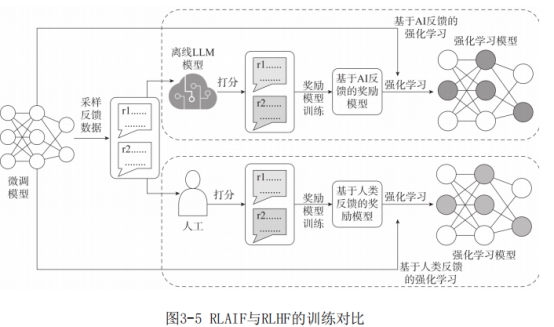 RLAIF(Reinforcement Learning with AI Feedback,基于AI反馈的强化学习)是由谷歌提出的,从名称可以看出,它们并没有放弃强化学习,而是采用人工智能反馈学习代替原先的人类反馈学习,也就是让模型向表现更好AI模型进行对齐。图3-5为RLAIF与RLHF的训练对比。