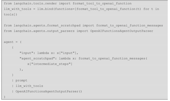 步骤4:构建和配置Agent。结合LLM、工具和提示词模板创建Agent。使用OpenAI-FunctionsAgentOutputParser将输出消息转换为Agent动作。