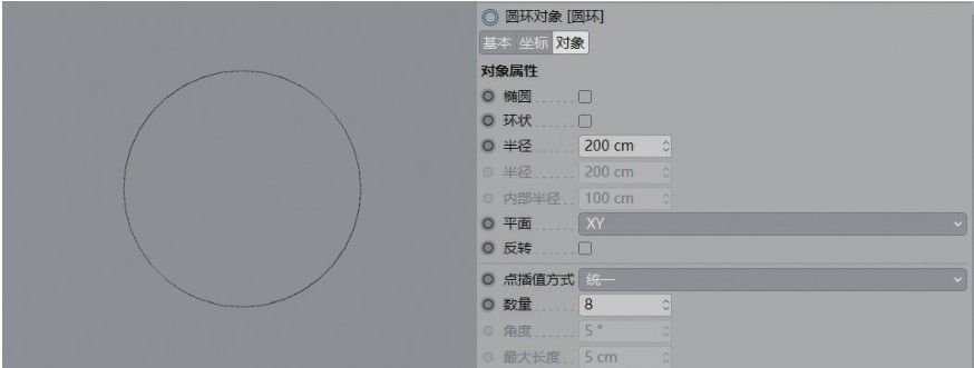 ,在场景中创建一个圆环,在“对象”选项卡中设置“半径”为180cm,如图2-118所示。