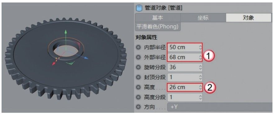在齿轮模型内创建一个管道模型,设置“内部半径”为68cm,“外部半径”为200cm,“旋转分段”为36,“封顶分段”为1,“高度”为18cm,如图2-141所示。