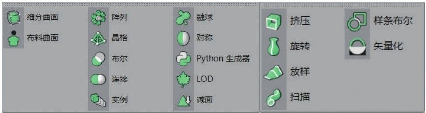 Cinema 4D中的“生成器”由两部分组成。这两部分的工具都是绿色图标,其中“细分曲面”按钮