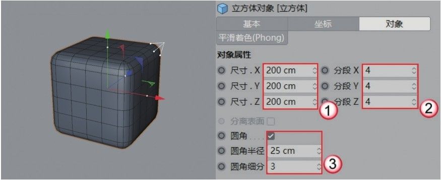 在场景中创建一个立方体模型,设置“尺寸.X”“尺寸.Y”“尺寸.Z”都为200cm,“分段X”“分段Y”“分段Z”都为4,勾选“圆角”,设置“圆角半径”为25cm,“圆角细分”为3,如图4-310所示。