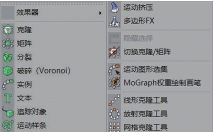 “运动图形”菜单中列举了Cinema 4D里的运动图形工具,如图10-1所示。这些工具能形成复杂的模型或动画效果,从而降低模型制作的复杂程度。