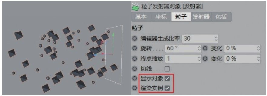 05 在“粒子”选项卡中勾选“显示对象”和“渲染实例”选项,然后移动时间滑块,可以观察到角锥模型和球体模型替代了原有的粒子,如图14-33所示。