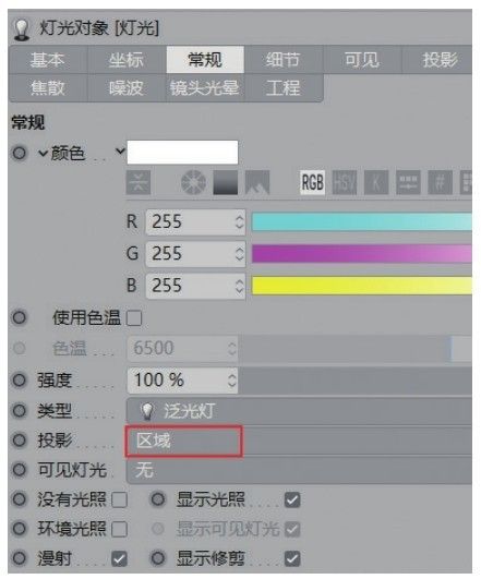 14 选中创建的灯光,设置“投影”为“区域”,如图14-189所示。
