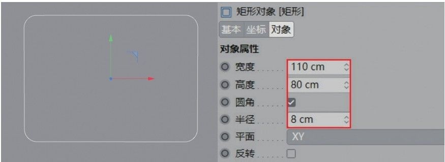 在场景中绘制一个矩形样条,设置“宽度”为110cm,“高度”为80cm,“半径”为8cm,如图16-90所示。