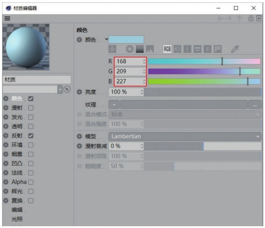01 在场景中新建一个默认材质,设置“颜色”为(R:168, G:209,B:227),如图16-169所示。