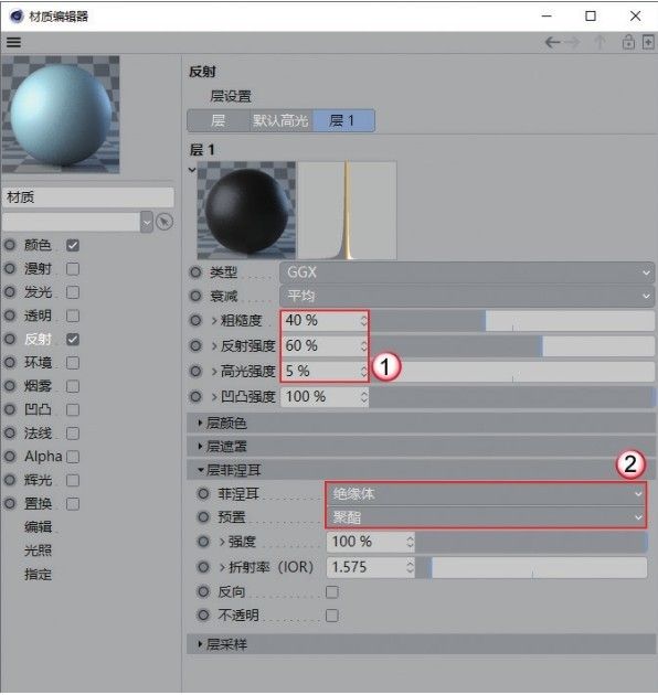 02 在“反射”中添加GGX,设置“粗糙度”为40%,“反射强度”为60%,“高光强度”为5%,“菲涅耳”为“绝缘体”,“预置”为“聚酯”,如图16-170所示。材质效果如图16-171所示。