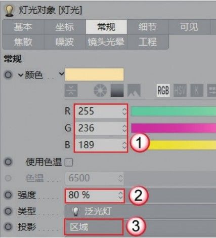 02 选中创建的灯光,在“常规”选项卡中设置“颜色”为(R:255,G:236,B:189),“强度”为80%,“投影”为“区域”,如图16-233所示。