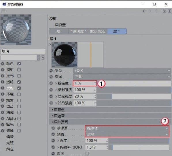 02 在“反射”中添加GGX,设置“粗糙度”为1%,“菲涅耳”为“绝缘体”,“预置”为“玻璃”,如图16-248所示。材质效果如图16-249所示。