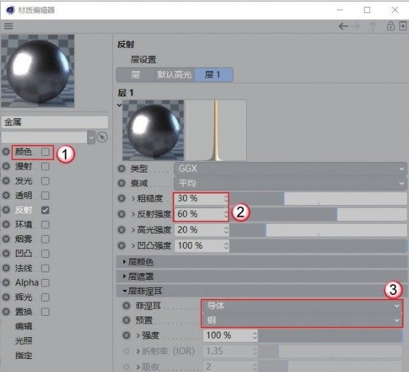 01 在“材质”面板新建一个默认材质,取消勾选“颜色”,然后在“反射”中添加GGX,设置“粗糙度”为30%,“反射强度”为60%,“菲涅耳”为“导体”,“预置”为“钢”,如图16-251所示。材质效果如图16-252所示。