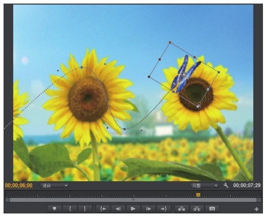 11 将时间指针移动到第6秒的位置,然后将监视器窗口中的蝴蝶图像移动到画面中图8-57所示的位置,并适当缩小尺寸。