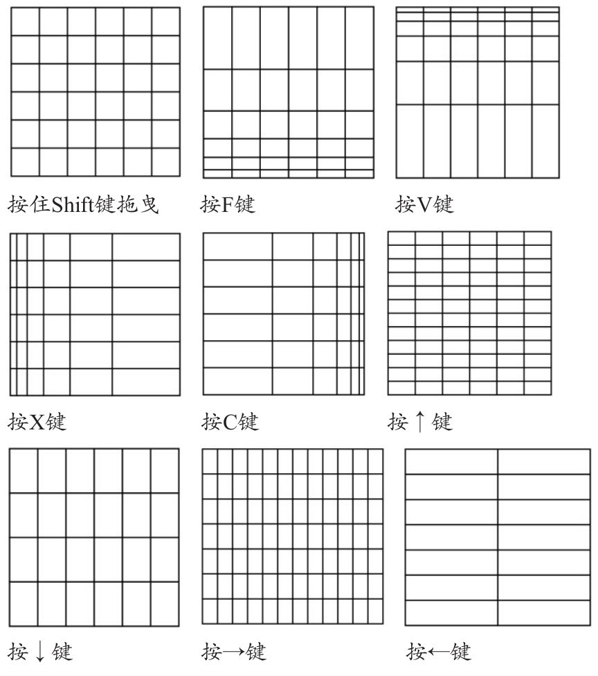 ,在画板上拖曳鼠标,可以自定义网格大小。拖曳鼠标时,按住Shift键,可以创建正方形网格;按住Alt键,会以起点为中心向外绘制网格;按F键/V键可调整网格中的水平分隔线间距;按X键/C键,可调整垂直分隔线的间距;按↑键/↓键,可以增加/减少水平分隔线;按→键/←键,可以增加/减少垂直分隔线。