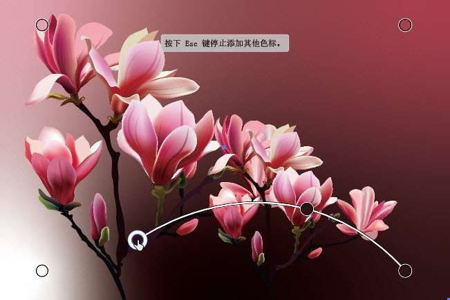 02 单击右下角的色标,如图2-366所示;向左侧移动鼠标指针,再单击鼠标,添加第2个色标,此时会有一条直线将它们连接,如图2-367所示;移动鼠标指针并单击,创建第3个色标,这时直线会变为曲线,如图2-368所示;单击左下角的色标,用曲线将它也连接起来,如图2-369所示;之后再添加一个色标,如图2-370所示。拖曳色标,调一调位置,如图2-371所示。
