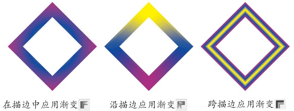 任意形状渐变只能用于填色,线性渐变和径向渐变则可以填色和描边。操作时,先选取对象,然后将描边设置为当前编辑状态,之后添加渐变即可,如图2-389所示。此外,还可单击“渐变”面板中的按钮,调整描边位置,包括在描边中应用渐变