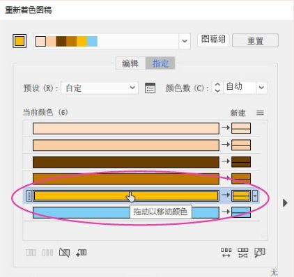 使用“重新着色图稿”对话框中的“指定”选项卡同样可以查看和调整颜色组中的颜色。这是前面3种方法之外的第4种选择。只需了解即可,因为在实际使用上,更多的是在“指定”选项卡中完成替换图稿原始颜色的操作。不过这有一个前提,就是先要选取图稿,之后才能指定颜色。这个次序一定要对才行。