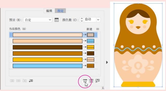 按钮,打开菜单,可以选择一个色板库,替换图稿颜色。图稿重新着色:调色时可以在画板中预览颜色的变化情况(该选项默认为被勾选状态)。