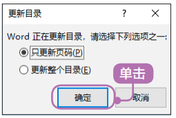 在弹出的【更新目录】对话框中单击选中【只更新页码】单选项,单击【确定】按钮,即可完成目录页码的更新(见右栏图) 。