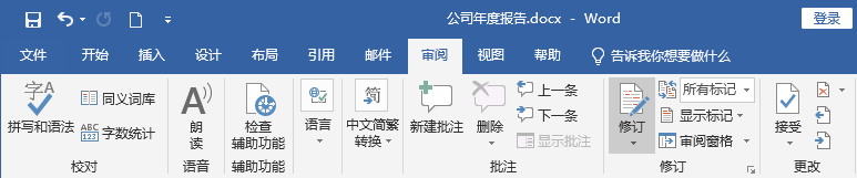在“公司年度报告”文档中选择【审阅】选项卡下【修订】组中的【修订】 Ø【修订】 选项(见下图) 。